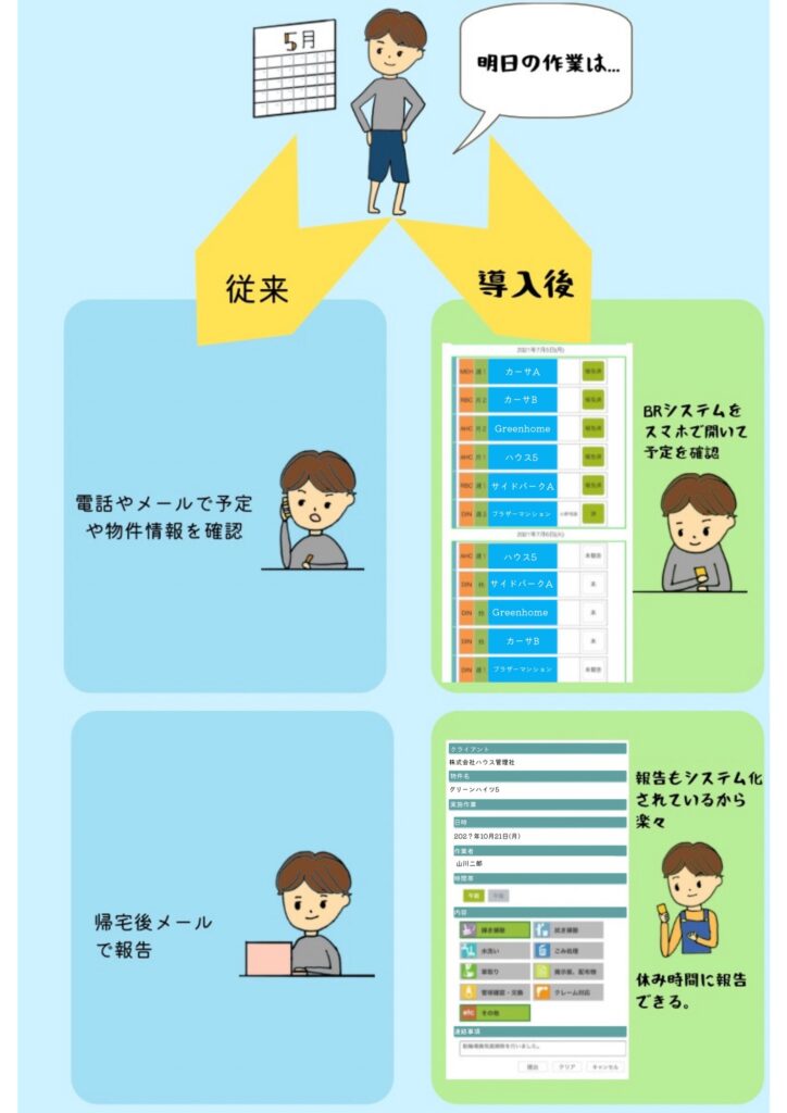 写真付きの作業報告書も現場担当者が手元のスマートフォンやタブレットで作成でき、管理者はweb上でチェックするだけなので事務所にいる必要はありません。