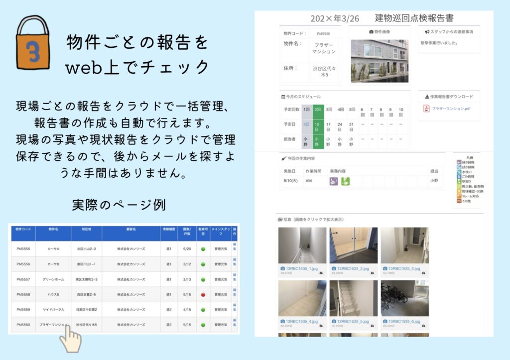 清掃スタッフからの報告をすぐweb上で確認し物件の状況をいつでも把握できます。